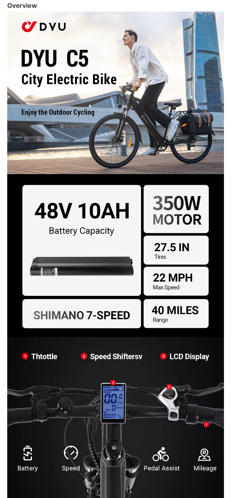 DYU C5 e-bike 27.5 Inch 48V 10Ah 7 Speed City road Mountain eBike Aluminum alloy full suspension Color: Black