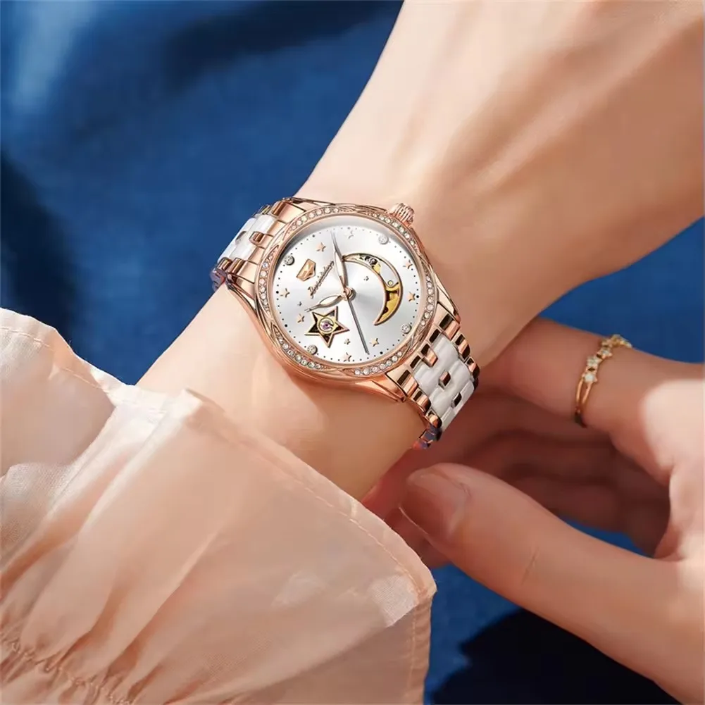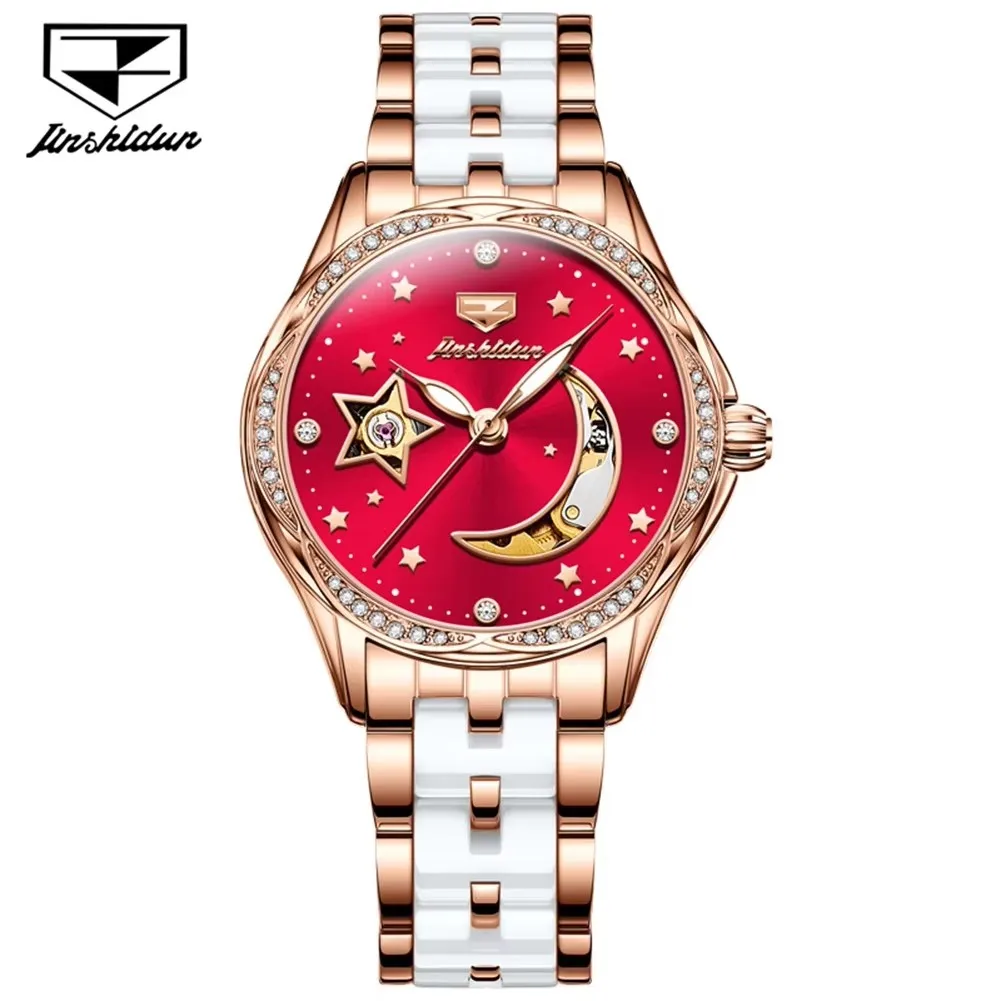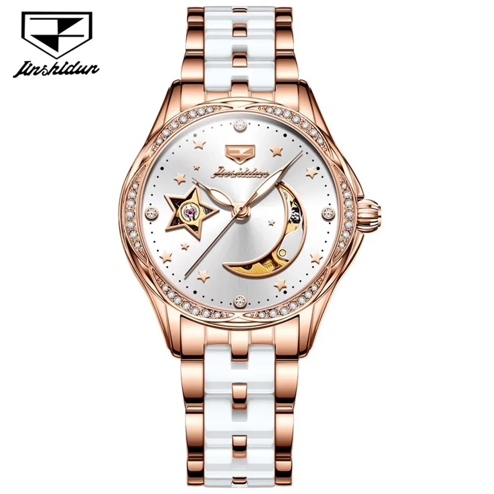 Jsdun 8962 Hollow Moon Star Diamond Dial Brand Elegant Automatic Mechanical Women’s Watch Luxury Stainless Strap Women’s Watches