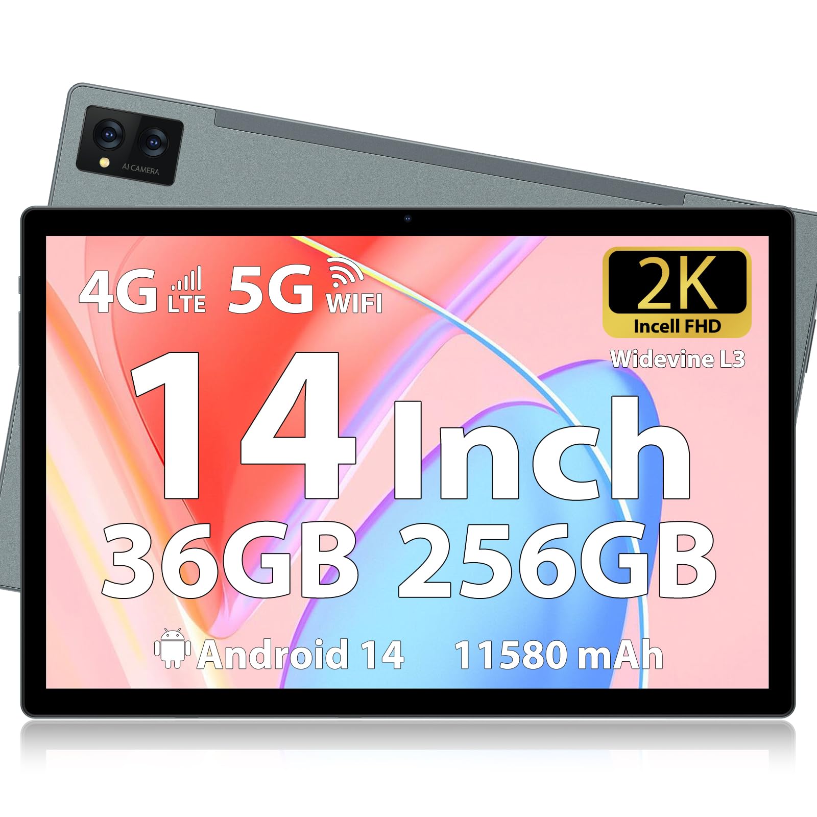 FLYCOAY Tablet 14 inch Android 14 Tablets, 256GB ROM(Expand to 2TB),36GB(12+24) RAM, Octa-Core 2.0GHz,11580mAh Battery, 2000 * 1200 FHD 4 Speakers, 4G LTE/5G WiFi, with Case,Pen,Earphone,Gray